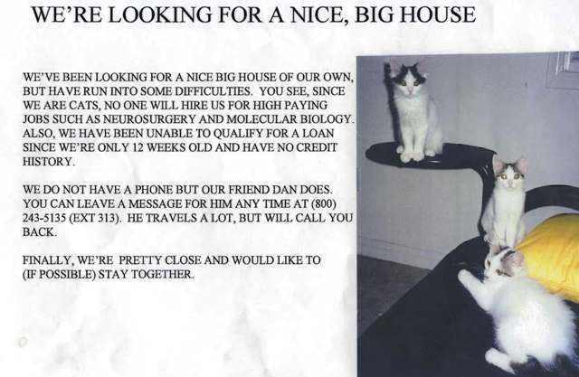 Two weeks later the kittens (named Marsha, Jan, and Cindy by my friend Jen) were ready for adoption. Overnight their internal switches flipped from “fully feral” to “awesome pets” and they were ready for loving homes. Posted the following ad around The LJ: