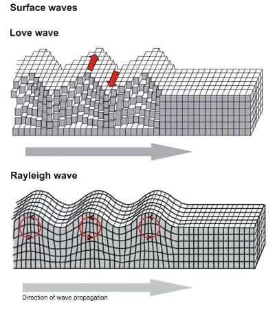 When the mantel moves, the plates move towards or away from each other. Movement can either be compressional, transformational, or extensional. When plates collide, the edges rip and create energy in the form of seismic waves. The combination of Rayleigh waves and Love waves create both the rolling waves and the side to side twisting seen in earthquakes.