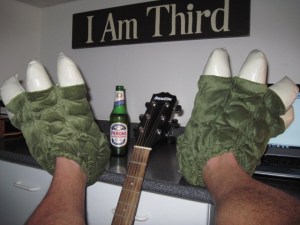 (Please right click the link below to open the suggested background music to this evening’s gathering in a new browser window. You really should open the song if you normally just read here because the Godzilla slippers move to the music and the sing along aspect of this evening’s get together is pointless without the music. Unless you sing really, really well a cappella. Not just in your car, because everyone sings well in their car…I mean that you truly sing well a cappella. Few can.)