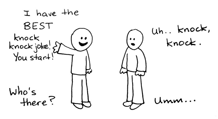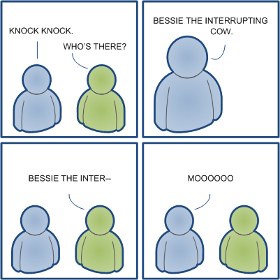 Person #1:    “Huh?”     (pause)    (pause)   “What?”    (pause)   “Huh”  (pause) (pause) (pause) “MOOOOOOOOOOOOOOOOOOOOOOOOOOOOOO”