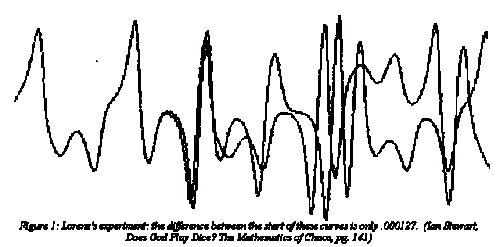 Up until Edward Lorenz was playing with a weather predicting model on his computer at MIT in 1961, most businesses, governments, and people believed that everything in the universe was directly caused by other things. Lorenz (and many others who followed him in math, biology, economics, ad infinitum) proved the sensitive dependence on initial conditions which postulates (and proves mathematically) that just a minute change in the initial conditions can drastically change the long-term behavior of a system. Instead of typing .506127, Lorenz typed only .506 and the results veered drastically from the normal pattern described when he typed in .506127. Theoretically, the results should not have been that far off from the predicted pattern because those last three digits are impossible to measure using reasonable methods.