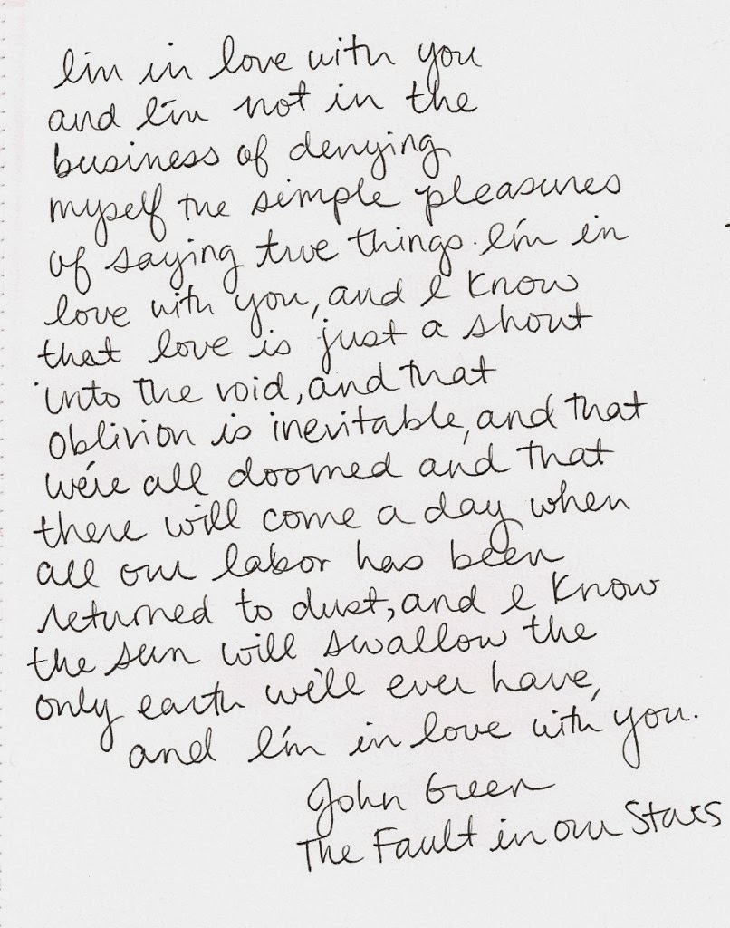 Go buy all his books and read them.   They are chew toys of books….you can knock them off in an hour or two.   If you don’t have that extra ten hours to devote, here are a few most excellent excerpts from John Green books.   Homeboy can certainly turn a phrase.